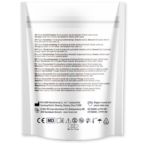 10 stk. tilpassbare plaster levert i en papirpose (150 x 95 mm). Fullfarget digitalt print er tilgjengelig på emballasjen. Produktene våre oppfyller de strenge kravene i Medical Device Regulation (MDR) og er registrert hos FDA i flere land. Samsvarer med ISO14001:2015- og ISO9001:2015-standardene. Plasterstørrelse: 72 x 19 mm.
