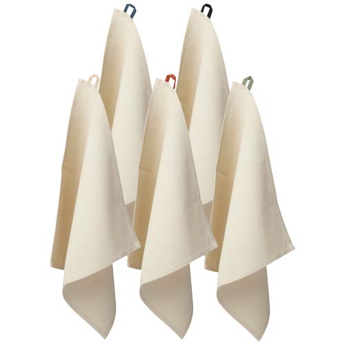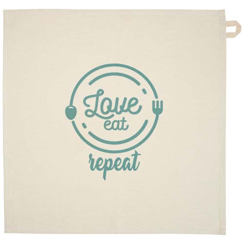 Kjøkkenhåndkle laget av 100 % GRS sertifisert 200 g/m² resirkulert bomull, med en karakteristisk kontrastløkke. Håndklestørrelse: 50 x 50 cm.