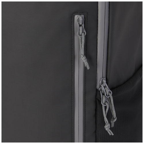 Vanntett PC sekk laget av GRS sertifiserte resirkulerte materialer, inkludert glidelåser. Den har et polstret 15" laptoprom med sideåpning for rask tilgang, flere nettinglommer, frontlomme med glidelås og reflekterende lommer for synlighet. Den støpte og polstrede baksiden og den justerbare bryststroppen gjør den behagelig å bære med seg, også når den er fullastet. GRS resirkulerte materialer inkluderer hovedstoff, fôr, nett og glidelåser. Kapasitet: 21 liter. PVC fri.