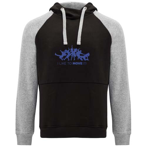 Tofarget unisex hettegenser. Hette med krysset hals og maljer i metall. Kontrasterende innerhette, snøring og raglan ermer. Kengurulomme. Mansjetter og kant i 1×1 elastan ribbestrikk. Avtakbar etikett.