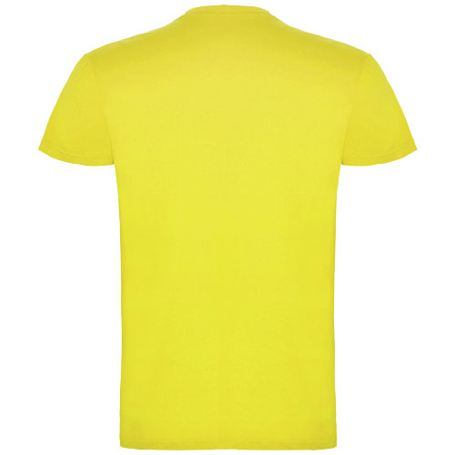 Kortermet T-skjorte med dobbel, rund hals med elastan. Laget i rundstrikket stoff. Med forsterket søm i hals. Avtakbar etikett. Modellen er 120 cm og har på seg str. 5/6.