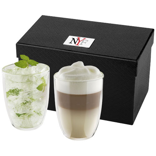 Sett med isolerende 290 ml-glass med doble vegger. Glassene egner seg ideelt til å servere yndlingsmacchiatoen eller yndlings-isteen din, eller en hvilken som helst varm eller kald drikke. Leveres i luksuriøs gaveeske. Logoplate følger med.
