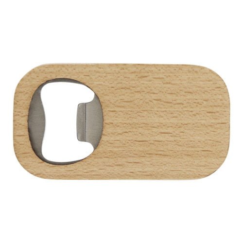 Flaskeåpner i rustfritt stål med treoverflate.