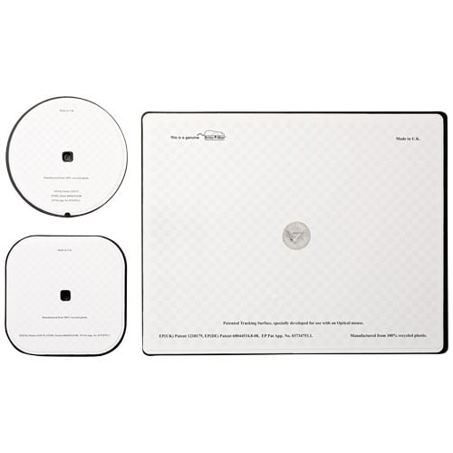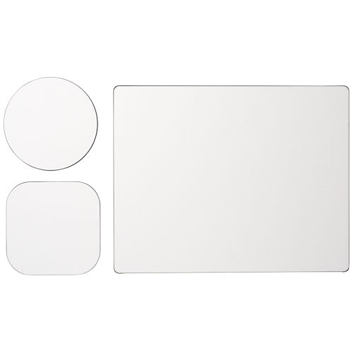 Leveres med en Brite-Mat-musematte og et sett med matchende underlag. Settet består av en rektangulær musematte (0,3 x 19 x 21 cm), firkantet underlegg (0,3 x 9,5 x 9,5 cm) og rundt underlegg (0,3 x ø9,5 cm).