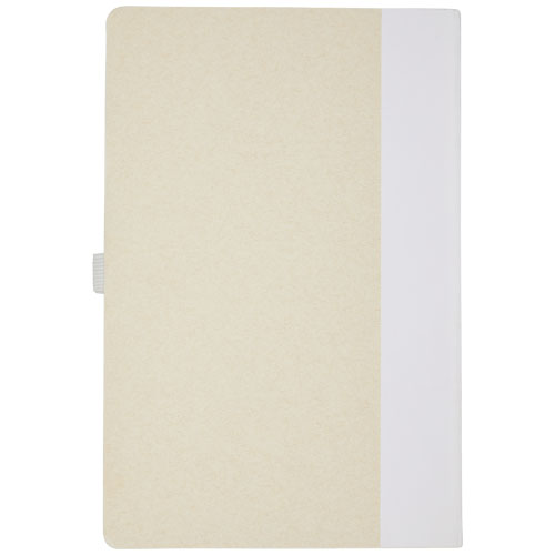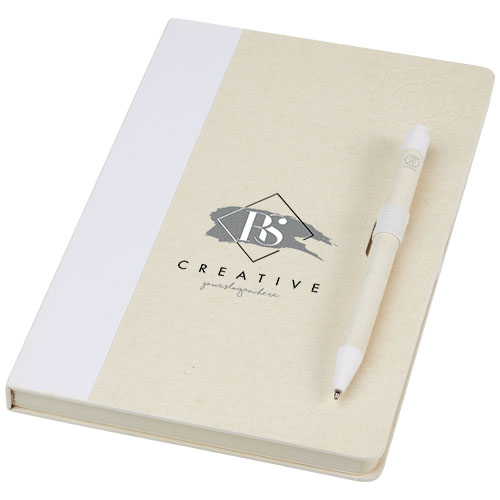 Sett med notatblokk i A5 størrelse og kulepenn. Notatblokken har 80 linjerte ark (80 g/m²) laget av resirkulerte melkekartonger (opptil 70 %), en farget papirspinal og en pennesløyfe. I pennesløyfen er det en kulepenn i matchende farge med notatblokken. Pennen har en pennekropp laget av samme resirkulerte melkekartongmateriale. Knappen, klipset og spissen er laget av farget PLA plast. Pennen har en svart refill. Brukte melkekartonger samles inn, sorteres, bearbeides og gjøres om til papir – noe som virkelig gjør om avfall til noe nyttig.