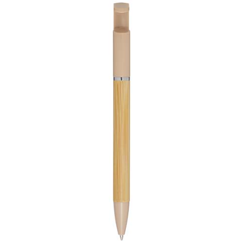Bambuskulepenn som også fungerer som telefonholder. Knappen og midtringen er laget av resirkulert plast, tuppen er laget av messing, og pennekroppen er laget av ansvarlig produsert bambus. Blekkfarge: Blå. Skrivelengde: 1000 meter. Spisstørrelse: 1,0 mm.