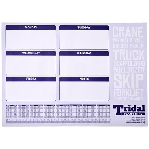 Hvit A2 Desk-Mate® notatblokk med 80 g/m² papir. Fullfargetrykk tilgjengelig for hvert ark. Tilgjengelig i 2 størrelser (25/50 ark.)