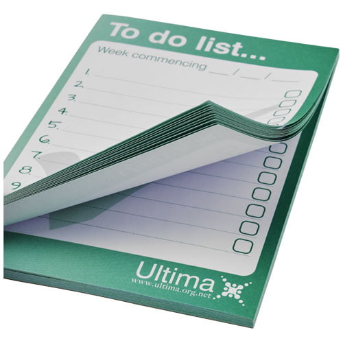 Hvit A6 Desk-Mate® notatblokk med 80 g/m² papir. Fullfargetrykk tilgjengelig for hvert ark. Tilgjengelig i 3 størrelser (25/50/100 ark.)