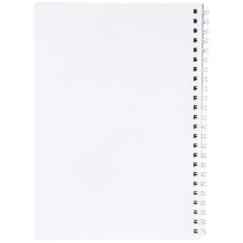 Desk-Mate® A5 notatbok med spiral. Standard modell inneholder 50 blanke 80 g/m² ark, glossy frontomslag i papp (250 g/m²) og et 450 mikron transparent polypropylen cover. Sort eller hvit spiral. Også tilgjengelig med 100 ark. Sidene i denne allsidige notatboken kan tilpasses slik du ønsker – enten du ønsker linjer, ruter eller dottet – alt er mulig!