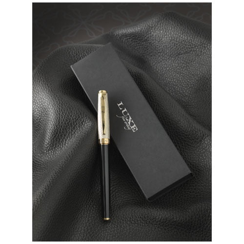 En luksuriøs rollerballpenn med skinnhette i gull og lakkerte gylne deler, levert i en Luxe gaveeske. Nedre sylinder er laget av lakkert messing og øvre sylinder er av messing og PU. Rollerballpenn: 14 cm x 1,15 cm, vekt: 32 gr, skrivelengde: 500 m.