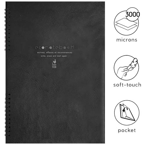 Takket være det vanntette og rivesikre papiret er A4 EcoNotebook med PU-skinnperm evig gjenbrukbar! Bruk den medfølgende pennen til å ta notater på det 100 % biologisk nedbrytbare papiret. Det er tre slettealternativer: viskelær på pennen for å slette små notater, rengjøringsserviett eller en hårføner for å slette større notater. Leveres med 48 gjenbrukbare sider (24 ark). Produsert i Frankrike. Produktdimensjoner (lukket): 20,8 x 29,3 x 0,4 cm. Pakket i en pose laget av resirkulert bomull (33 x 25 x 4,5 cm). Livstidsgaranti. Skrivelengde: 400 meter.