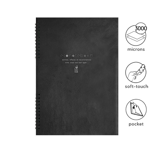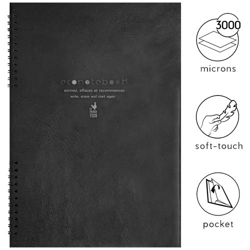 Takket være det vanntette og rivesikre papiret, er A5 EcoNotebook med PU-skinnperm evig gjenbrukbar! Bruk den medfølgende pennen til å ta notater på det 100 % biologisk nedbrytbare papiret. Det er tre slettealternativer: viskelær på pennen for å slette små notater, rengjøringsserviett eller en hårføner for å slette større notater. Leveres med 48 gjenbrukbare sider (24 ark). Produsert i Frankrike. Produktdimensjoner (lukket): 14,6 x 20,7 x 0,4 cm. Pakket i en pose laget av resirkulert bomull (25 x 19 x 4,5 cm). Livstidsgaranti. Skrivelengde: 400 meter.