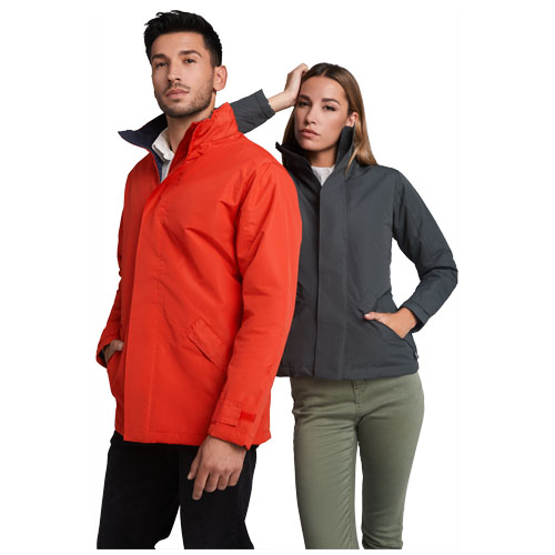 Parkas med høy krage med glidelås i samme farge. Sentral støpt glidelås med matchende klaff. Høy krage med brettbar hette. Ytterlommer med glidelås og klaff. To innerlommer med borrelås. Enkel tilgang til innsiden for silketrykking og brodering. Vanntett. Vindtett. Modellen er 184 cm og har på seg str. L.