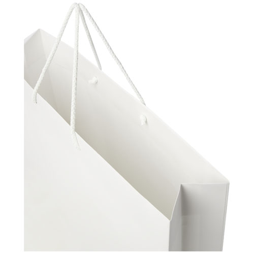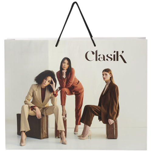 XXL håndlaget matt 170 g/m2 Integra papirpose (45 x 10 x 35 cm) med plasthåndtak. Store logomulighet på både for- og baksiden gjør den perfekt til markedsøfring av logo/budskap. Produsert i Europa og 100% resirkulerbar.