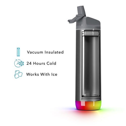 Verdens smarteste vannflaske! Laget av vakuumisolert rustfritt stålmateriale, som holder drikkevarer kalde i opptil 24 timer. Det lekkasjesikre halmlokket har et beskyttende cover for å holde det rent. Etter å ha satt hydreringsmålene, lyser LED smart sensor «puck» for å minne deg på når det er på tide å drikke. Synkroniser flasken via Bluetooth® til HidrateSpark ® appen for å spore vanninntaket og hydreringsnivået, eller til og med for å bruke «Finn flasken» funksjonen! BPA fri.