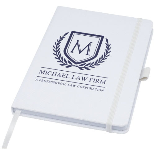 Notatblokk i A5-størrelse med cover laget av RPET-stoff. Har 80 ark av 70 g/m² resirkulert papir med linjert layout, en penneløkke og båndmarkør. Kan kombineres med 107757 Honua RPET-kulepenn.
