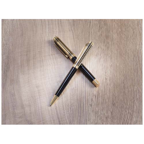 Legato pennesettet er en elegant kombinasjon av en kulepenn og rollerpenn. Begge pennene har en øvre del av resirkulert messing med gullforkrommet finish, nedre pennekropp med svart spraybelegg, metallgullforkrommet tilbehør, en LUXE logo på midtringen og blått blekk. Kulepennen har en skrivelengde på 800 meter, og 1,00 mm nib størrelse. Rollerpennen har en skrivelengde på 400 meter og 0,7 mm nib størrelse.