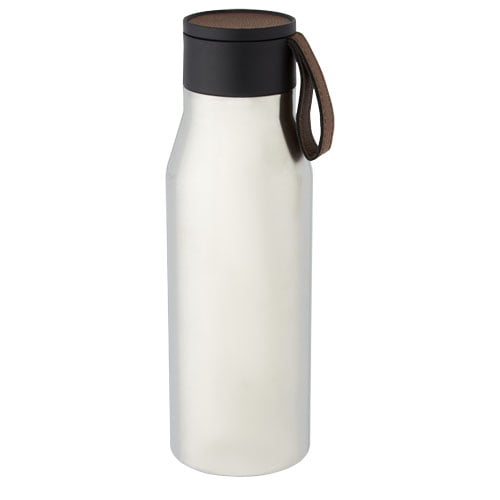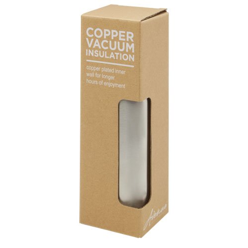 Kobber vakuumisolert termoflaske i rustfritt stål med et klassisk og elegant design. Rem og detaljer på lokket i PU lær. Dette gjør den ideell for lasergravering, som vil markere logoen i en sølvfarge for å skape en vakker visuell effekt. Dobbeltvegget, kobbervakuumisolert 18/8 i rustfritt stål holder drikken varm eller kald i flere timer. Testet og godkjent i henhold til tysk lovgivning for matsikkerhet (German Food Safe Legislation/LFGB), og testet for ftalater i henhold til REACH forskrifter. Kapasitet 500 ml. Kommer i en hvit gaveeske i papp.