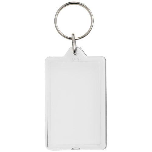 Clear rektangulært G1 nøkkelkjede med nøkkelring i metall. Denne nøkkelringen kan åpnes med en mynt. Metalløkkeringen har en flat profil, noe som gjør den ideell for utsendelse. Utskriftsdimensjoner for innlegg: 5,0 cm x 3,0 cm.