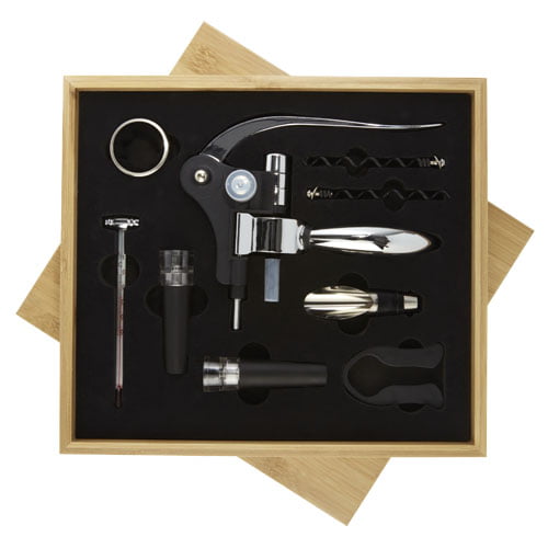 9-delers vinsett inkludert 1 korketrekker, 2 propper, 1 heller, 1 ring, 1 foliekutter, 1 termometer og 2 ekstra korketrekkere. Leveres i en gaveeske av bambus, høstet og produsert etter bærekraftige standarder.