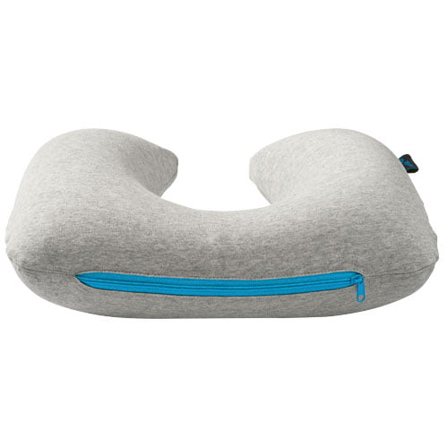 Mykt reisesett som inneholder oppblåsbar nakkepute med lyseblå glidelås, øyemaske med lyseblå strikk og lyseblå ørepropper pakket i en myk veske med lyseblå snørelukking.