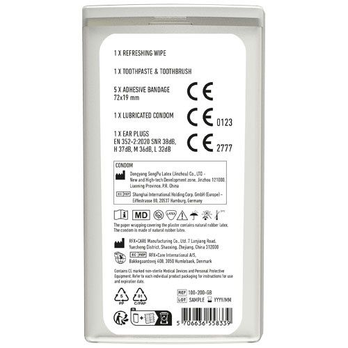 Dette er det ideelle reisesettet for festivaler og inneholder alt som trengs for en overnatting på en festival eller fest. Størrelsen på dette settet gjør at du enkelt kan oppbevare det i vesken eller lommen. Innhold: 1 tannbørste, 1 tannkrem, 1 ørepropper, 1 antibakteriell gel, 5 vannbestandige plaster, 1 kondom. Alle førstehjelps- og behandlingsprodukter i settet oppfyller alle gjeldende EU-forskrifter. Prisen inkluderer fullfarge trykk av etiketten.