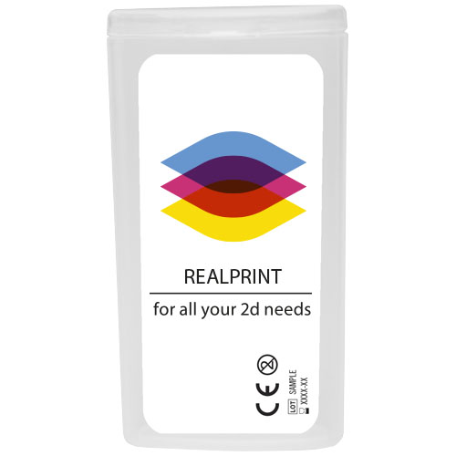 Det ideelle førstehjelpssettet å ha med. Størrelsen på dette settet gjør at du enkelt kan oppbevare det i vesken eller lommen. Med dette settet vil du alltid være forberedt på små ulykker. Innhold: 5 vannbestandige plaster, 2 hudrensende vattpinner. Alle førstehjelps- og behandlingsprodukter i settet oppfyller alle gjeldende EU-forskrifter. Prisen inkluderer fullfarge trykk av etiketten.