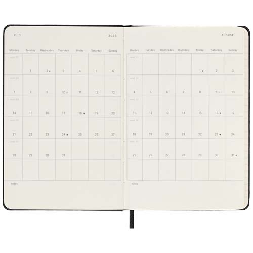 Med datering fra januar til desember 2025, viser innbundne Moleskine 12 måneders ukekalender i lommeformat uken på et øyeblikk. Samtidig har den sider som gir et årlig og månedlig øyeblikksbilde for en bredere oversikt over året, etterfulgt av sider for reiseplanlegging, ideer og mål. Ukedagene vises på to sider. Har elfenbensfarget syrefritt papir, svart elastisk lukking, sidebåndmarkør, fargekoordinert utvidbar innerlomme, klistremerker for personlig tilpasning og årsklistremerker for ryggen.