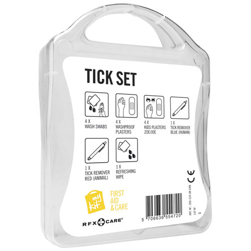 Det perfekte settet for å fjerne flått og behandle bitt hos mennesker og dyr. Innhold: 4 vannbestandige plaster, 4 rengjøringsservietter, 1 flåttfjerner, blå (til mennesker), 1 flåttfjerner krok (oransje), 4 barneplaster, 1 våtserviett. Alle førstehjelps- og behandlingsprodukter i settet oppfyller alle gjeldende EU-forskrifter. Prisen inkluderer fullfarge trykk av etiketten.