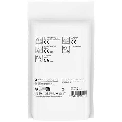 Dette settet bør oppbevares på ethvert kontor, slik at man er forberedt på uhell eller skader. Innhold: 12 vannbestandige plastre, 2 tørre vattpinner, 1 ansiktsmaske, 1 våtserviett og 4 hudrensende vattpinner. Alle førstehjelps- og behandlingsprodukter i settet oppfyller alle gjeldende EU-forskrifter. Prisen inkluderer full fargeutskrift. Leveres i en papirpose.