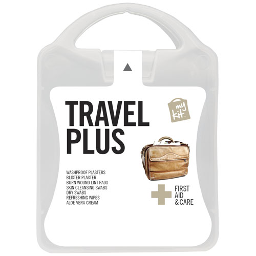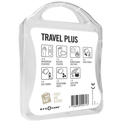 Ideelt førstehjelpssett for reisende. Med dette omfattende settet er du forberedt på å behandle skader under turen. Innhold: 12 vannbestandige plaster, 4 hudrensende vattpinner, 2 tørre vattpinner, 2 lindrende puter ved brannsår, 1 gnagsårplaster, 2 våtservietter, 1 aloe vera-krem. Alle førstehjelps- og behandlingsprodukter i settet oppfyller alle gjeldende EU-forskrifter. Prisen inkluderer fullfarge trykk av etiketten.