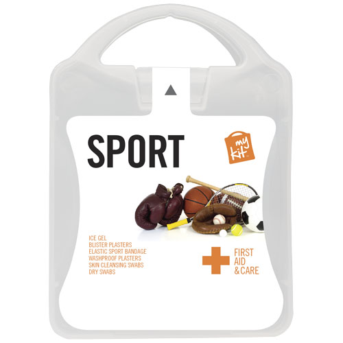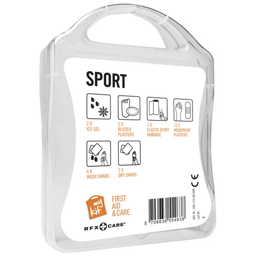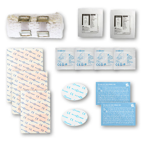 Ideelt førstehjelpssett for den aktive. Dette settet forbereder deg på små skader og ulykker. Innhold: 12 vannbestandige plaster, 4 hudrensende vattpinner, 2 tørre vattpinner, 2 isgel, 2 gnagsårplaster, 1 elastisk sportsbandasje. Alle førstehjelps- og behandlingsprodukter i settet oppfyller alle gjeldende EU-forskrifter. Prisen inkluderer fullfarge trykk av etiketten.