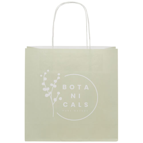 Liten 120 g/m2 pose av kraftpapir (24 x 9 x 24 cm) med vridde papirhåndtak. Store logomulighet på både for- og baksiden gjør den perfekt til markedsøfring av logo/budskap. Produsert i Europa og 100 % resirkulerbar, noe som gjør denne posen til et mer bærekraftig valg for miljøbevisste bedrifter og enkeltpersoner på jakt etter en bærekraftig emballasjeløsning.