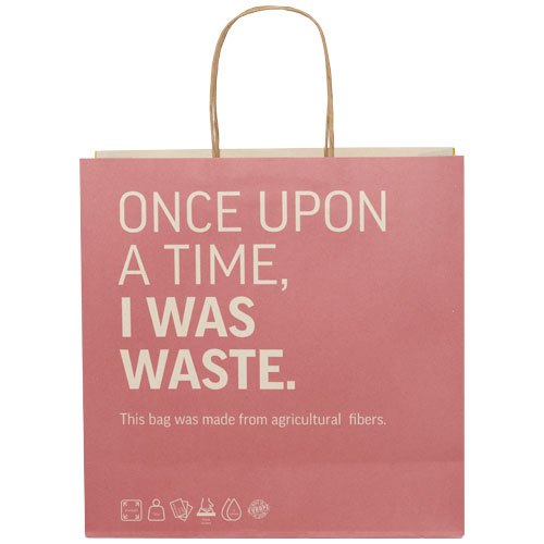 Ekstra stor 150 g/m2 papirpose (31 x 12 x 31 cm) laget av landbruksavfall med vridde papirhåndtak. Store logomulighet på både for- og baksiden gjør den perfekt til markedsøfring av logo/budskap. Produsert i Europa og er 100 % resirkulerbar. Produksjonen av denne posen er et mer bærekraftig valg for miljøbevisste bedrifter og enkeltpersoner, som leter etter en bærekraftig emballasjeløsning.