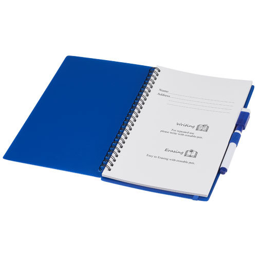 Bærekraftig notatblokk med fokus på å redusere bruken av papir for å spare miljøet. Etter en stund med notater, tegning eller idémyldring, kan sidene rengjøres med viskelær på markøren for å gjenbruke sidene igjen. Den kan også rengjøres med en vanlig stoffklut (ikke inkludert). Har 20 ark (40 siderr) med halvt stiplet og halvt blankt oppsett, og en svart skrivemarkør.