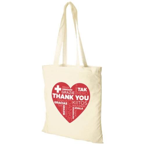 Solid og slitesterkt 180 g/m² bomullsnett med stort hovedrom og maksimal synlighet for enhver logo. Det robuste bomullsmaterialet gjør den egnet til å bære tyngre gjenstander. Håndtakene er 30 cm lange og derfor lange nok til å bære posen på den ene skulderen. Tåler vekt opp til 5 kg.