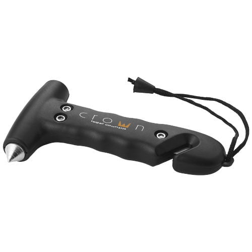 Nødhammer med håndleddstropp og innebygd beltekutter i håndtaket. To spisse vindusknusere i herdet stål og beltakutter kan brukes til å flykte dersom en uheldig situasjon skulle oppstå.