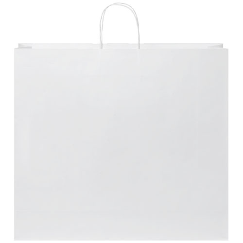 XXL pose av kraftpapir (49,5 x 14 x 44 cm.) med vridde håndtak. Den er laget i Europa av ansvarlig produsert papir (hvit 100 g/m², brun 90 g/m²), og er en bærekraftig og holdbar emballasjeløsning med god plass til en mengde gjenstander. Kraftpapirets naturlige og rustikke utseende gir en elegant touch til enhver anledning. Perfekt for handel, gaver eller arrangementer. Denne posen er et miljøvennlig alternativ til plastposer. Omfavn det praktiske og miljømessige ansvaret med våre poser av kraftpapir.