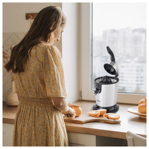 Kraftig 300 W saftpresse som virker raskt og utvinner maksimal mengde saft fra fruktene. Det innebygde aluminiumshåndtaket gjør driften enklere, raskere og renere. Alle delene er avtagbare og kan vaskes i oppvaskmaskin. Leveres med to kjegler i forskjellige størrelser for å tilpasse saftpressingen til frukten. Saftpressen har en antidrypp-funksjon og har et justerbart fruktkjøttfilter. Kapasitet 270 ml. Kabellengde: 108 cm. Støynivå: 85 dB.