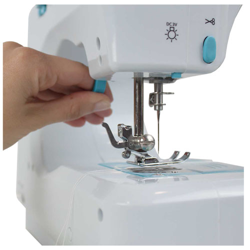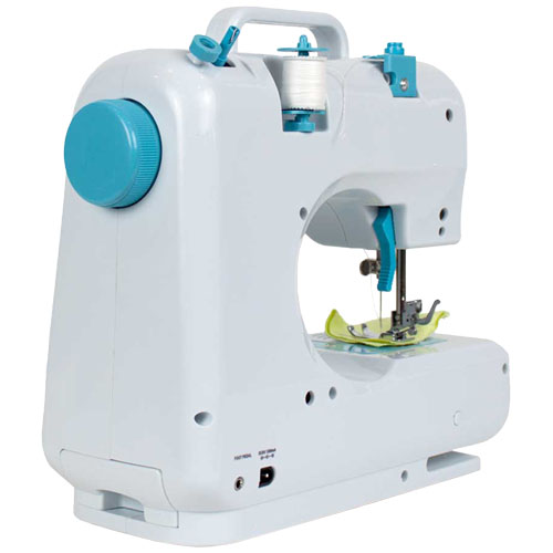 Symaskin med 12 innebygde stingmønstre. Integrert skuff for oppbevaring av gjenger, nåler og andre materialer. Lys for å forbedre synligheten mens du syr. Inkluderer pedal og adapter. Fremover – og bakoversøm. Maskinen slås på med den manuelle bryteren eller med fotpedalen. Den kan brukes koblet til veggkontakten eller med batterier (4 X AA). Spenningsregulator. Valgskive. Trådkutter. Bobbin styrehjul.