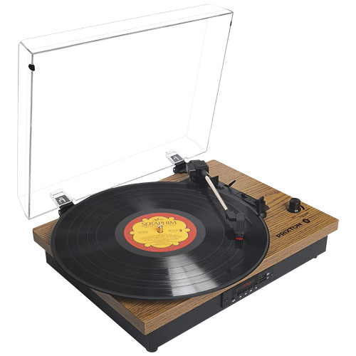 Bluetooth®-platespiller med to høyttalere på 5 W hver. Den avspiller vinylplater og forvandler dem til WAV-format gjennom SD-kortet og USB-tilkoblinger. Den integrerer også Bluetooth® 5.0 for å koble til enheter og spille av musikk. I tillegg spiller den via USB, SD-kort og FM-radio. Den har to RCA-lydutganger og hodetelefoner. Platespilleren har en klar støvhette og inkluderer en rubinstift. Laget av MDF-tre og plastmateriale med trekornfarge. Et gjennomsiktig støvdeksel er inkludert. Hastighet 33,3/45/78 o/min.
