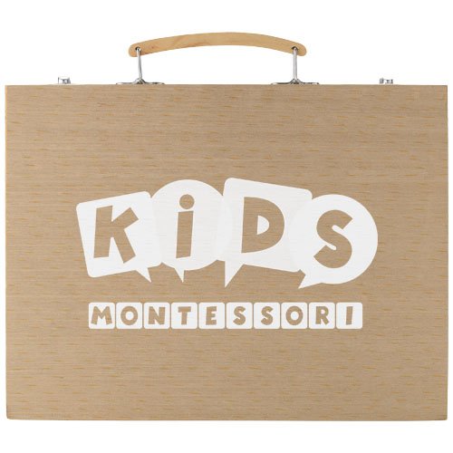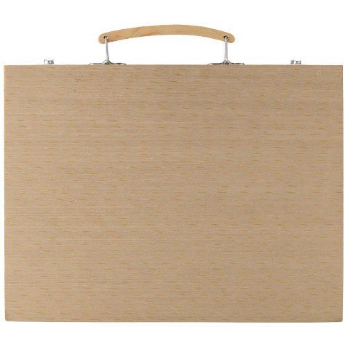 Sett med 12 vannfarger, 12 fargeblyanter, 12 fargetusjer, 12 oljefarger, 12 oljekritt, paletter, lim, viskelær, spisser, HB-blyant og pensel presentert i trekoffert. Dekorasjon er ikke mulig på delene.