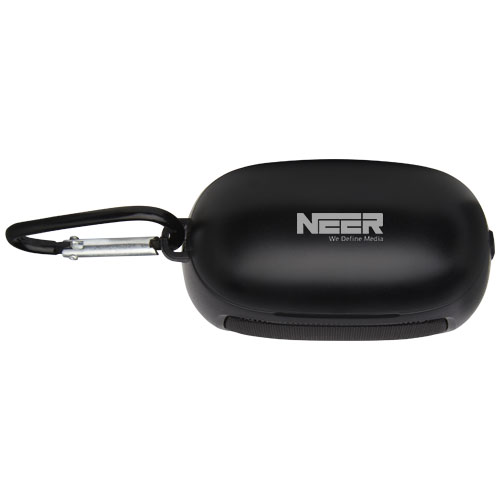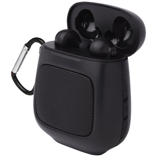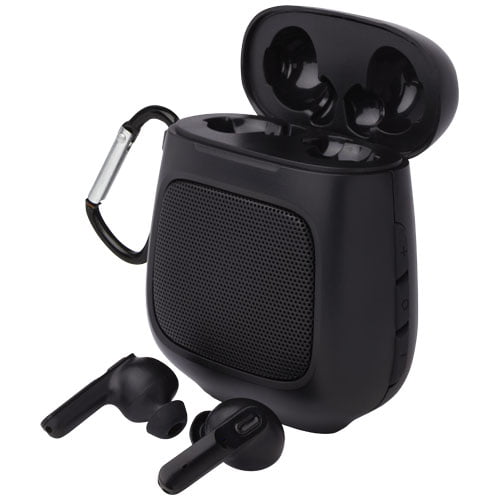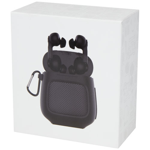 Remix kombinerer True Wireless-ørepropper med en Bluetooth®-høyttaler. Når øreproppene fjernes fra etuiet, slår de seg automatisk på og synkroniseres automatisk med hverandre. Bæreetuiet fungerer også som en ladestasjon for øreproppene, samt en Bluetooth®-høyttaler. Etuiet kan lade øreproppene fra 0 til 100 % fire ganger på en enkelt lading, mens øreproppene kan brukes i minst 4 timer før ny lading er nødvendig. Den ergonomiske utformingen av øreproppene holder dem komfortabelt og sikkert på plass mens du er på farten. Det tar omtrent 2 timer å lade øreproppene og høyttaleren fra 0 til 100 %. Både øreproppene og høyttaleren har en innebygd mikrofon og musikkontroller for å motta eller foreta telefonsamtaler. Bluetooth-rekkevidden er 10 meter. Middels og store ørepropper er inkludert. Levert i en premium gaveeske.