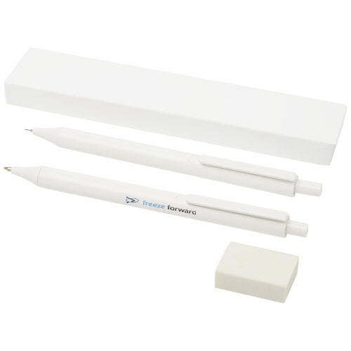 Antibakterielt pennesett bestående av en kulepenn med klikkmekanisme, trykkblyant og viskelær. Tilsetningsstoffet nanopulver reduserer veksten av mikroorganismer på pennenes overflate.