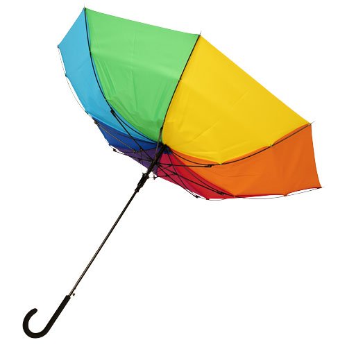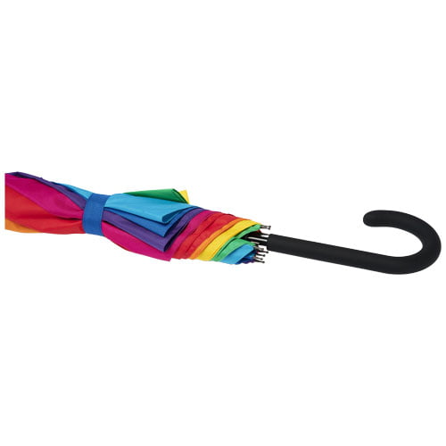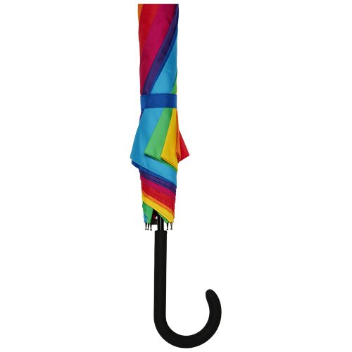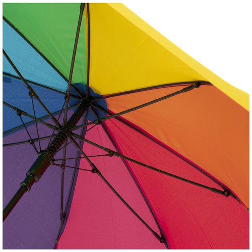 Paraply med automatisk åpning med regnbuefarget kunstig polyester baldakin. Solid metallskaft, høykvalitets full glassfiberramme som gir maksimal fleksibilitet under vindfulle forhold. Myke skjeve håndtak og nikkelbelagte tupper og topp. Stort dekorasjonsområde på alle paneler med mulighet for ulike kreative logoløsninger.