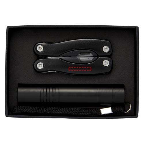 Multiverktøy med 11 funksjoner og LED lykt pakket i sort gaveeske. Batterier inkludert.