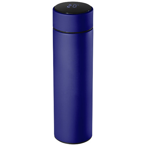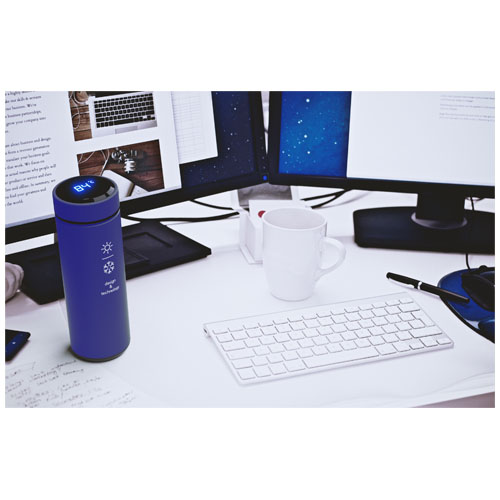 500 ml flaske i rustfritt stål, isolert og med doble vegger med antibakteriell behandling. Flasken er utstyrt med en temperatursensor. Takket være «berør og lys» systemet vises temperaturen på drikken på flaskekorken (i celsius). Passer for både varme og kalde drikker. Kommer i en sylindrisk gaveeske laget av resirkulert papir. Størrelse: Ø 47 x 225 mm. Batteri følger med: CR 2450 (3V). Batteriet kan ikke skiftes ut. Kan vise temperaturen 20 000 ganger.