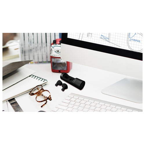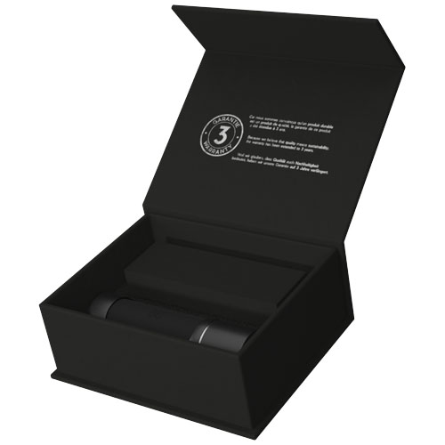 Trådløse ørepropper med førsteklasses lydkvalitet. Øreproppene kan lagres og lades i det sylindriske metalletuiet, som kan dekoreres med en opplyst logo. Batteriet i basen kan lade øreproppene to ganger. Innebygd mikrofon. Bluetooth® 5.0. EDR-teknologi (Enhanced Data Rate). Øreproppene er belagt med en gummiutførelse og antibakteriell behandling. Inkluderer ørepropper med 3 forskjellige størrelser for en optimal lytteopplevelse. Patent EUROPE EUIPO. Pakket i en sort gaveeske (10 x 6 x 3,5 cm) med magnetisk lukking. Inkluderer 3-års garanti.