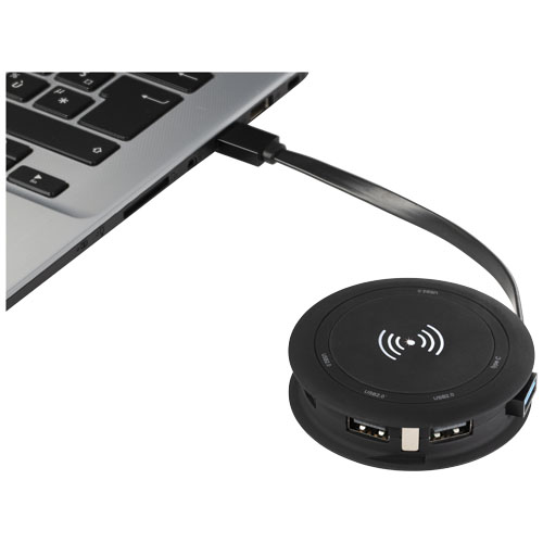 5W trådløs lader og hub med 4 USB 2.0-porter inkludert 1 type C 3.0, slik at du kan koble til opptil 4 enheter samtidig. Antibakteriell behandling og lysende logo. Patent EUROPA EUIPO.