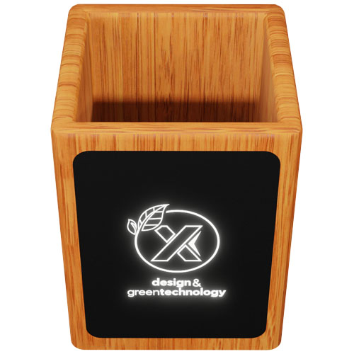 Penneholder av tre (7,2 x 7,2 x 9 cm) med 2 USB utganger: USB 1.0 og USB Type C 1.0A. Den lysende logoen påføres i front og lyser når produktet er koblet til. Leveres med en ladekabel laget av resirkulert PET. Bøketreet som brukes er fra bærekraftige, miljøriktige og sosialt ansvarlige kilder. Penneholderen er pakket i en gaveeske (11 x 7,5 x 8,4 cm) med magnetisk lukking. Inkluderer 3 års garanti.